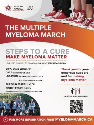 This Ottawa-Gatineau Multiple Myeloma March is a 5 km walk to raise funds that enable Myeloma Canada and the Ottawa Hospital to invest in important research that helps to extend and improve the lives of those living with Myeloma. By making a donation to this team, you are helping to fund clinical research and to support advocacy for accelerated access to game-changing therapies for Canadian myeloma patients.